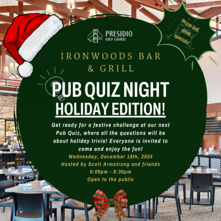 Ironwoods Bar & Grill 300 Finley Road, San Francisco, CA, United StatesJoin us for our exciting monthly Trivia Night, hosted by the one and only Scott Armstrong! This month, we’re diving into Holiday Trivia! Everyone is invited to participate. The Trivia kicks off at 6:00pm and wraps up at 8:00pm. Arrive a bit early to grab your favorite table. You can form your own team (there’s […]
