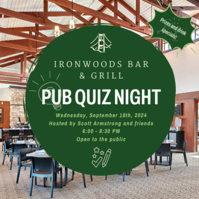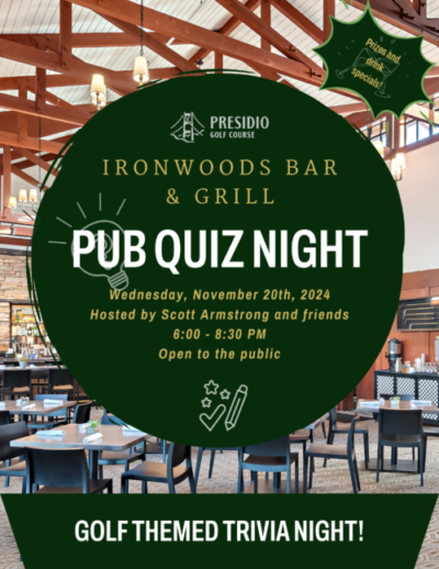 Ironwoods Bar & Grill 300 Finley Road, San Francisco, CA, United StatesPub Quiz Night has been a hit this year! Join us for August Pub Quiz Night, hosted by Scott Armstrong and friends at Ironwoods Bar & Grill. Prizes and drink specials will also be available! This November Pub Quiz will feature Golf Themed Questions! We're now using Eventbrite for reservations for all Ironwoods Bar & […]