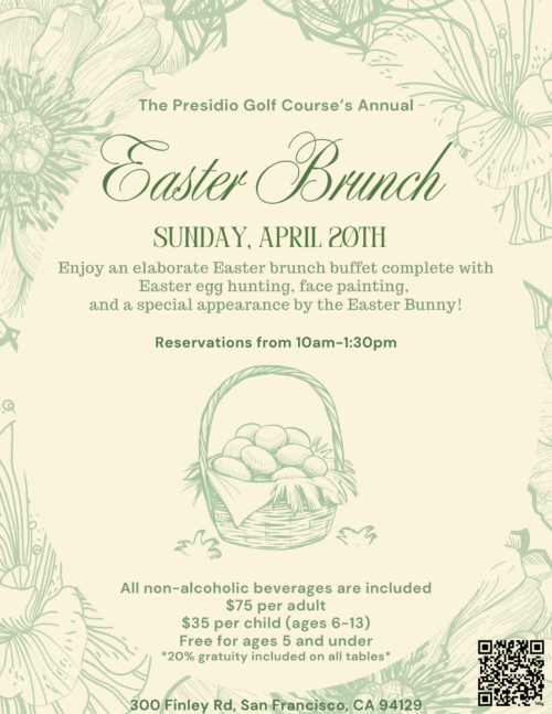 Ironwoods Bar & Grill 300 Finley Road, San Francisco, CA, United StatesJoin us for a delightful Easter brunch buffet featuring a fun Easter egg hunt, face-painting activities, and a special visit from the Easter Bunny! Book your table! Easter Brunch 2025 All non-alcoholic beverages are included $75 per adult $35 per child (ages 6-13) Free for ages 5 and under *20% gratuity included on all […]