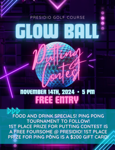 Welcome to the Glow Ball Putting Contest at The Presidio Golf Course! Get ready for a fun evening of glow-in-the-dark putting under the stars. Join us on Thu Nov 14 2024 at 5:00 PM at the beautiful Presidio Golf Course for a unique golfing experience. Grab your friends and family for a night of friendly competition and enjoy our unique putting course […]